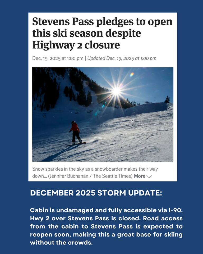 Streamlined Communication Stay Cascadia utilizes automated messaging to ensure an enjoyable experience for all our guests. We provide a checklist that allows guests to select early check-in or a late check-out, notifies us if a guest wants to bring a pet, as well as provides clear check-in instructions and the opportunity to share those instructions with your party. Rest assured there is a human monitoring all of this so if you have an actual question we will get back to you as soon as possible. This is a highly seasonal location. There is ~6 feet of snow in the winter. The spring and fall are absolutely stunning. Summer can be as hot as 95 degrees, but usually there is a nice breeze up in the mountains. Connectivity October 2021 update: we now have fast internet courtesy of Starlink and Sonos speakers for your whole-house listening pleasure! This allows for cozy streaming movie nights this winter with wonderful surround sound. Weather/Climate Please note that we do not offer free cancellation due to inclement weather, poor air quality, or high wildfire danger in the area, unless active road closures due to fire or weather conditions prohibit guests from accessing the house, or advise guests to evacuate during their stay (Level 2 or higher fire evacuation notice, or road closures completely prohibit travel from guests’ point of origin to the house). As a concrete example of this policy, if you are traveling by car from west of the Cascades, if Stevens Pass is closed, the cabin is still accessible via Snoqualmie Pass to Blewett Pass to Leavenworth or via Snoqualmie Pass to Wenatchee to Leavenworth, so a closure of Stevens Pass does not prohibit your travel options in this case. If Level 2 or higher fire evacuation notice is in effect or road closures completely prohibit travel from guests' point of origin to the house we will refund the guest each night that is in effect. If evacuation notice and closures remain in effect beyond half of the guest's scheduled stay we will issue an entire refund. In the case of a cancellation, the guest is required to make that cancellation and/or reschedule through Airbnb.