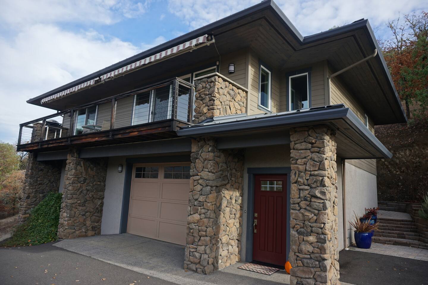 Relax overlooking Southern Oregon Rogue River rapids at this modern guesthouse. Sleep with the river sounds in comfortable beds. Gated, forested rural location in the heart of scenic beauty with wildlife and hiking trail on property. We are a smoke free house. Children 12+ are welcome. Prior approval for up to 2 dogs. No cats. Limit 4 overnight guests. Read House Rules by clicking on "Show More" below.
